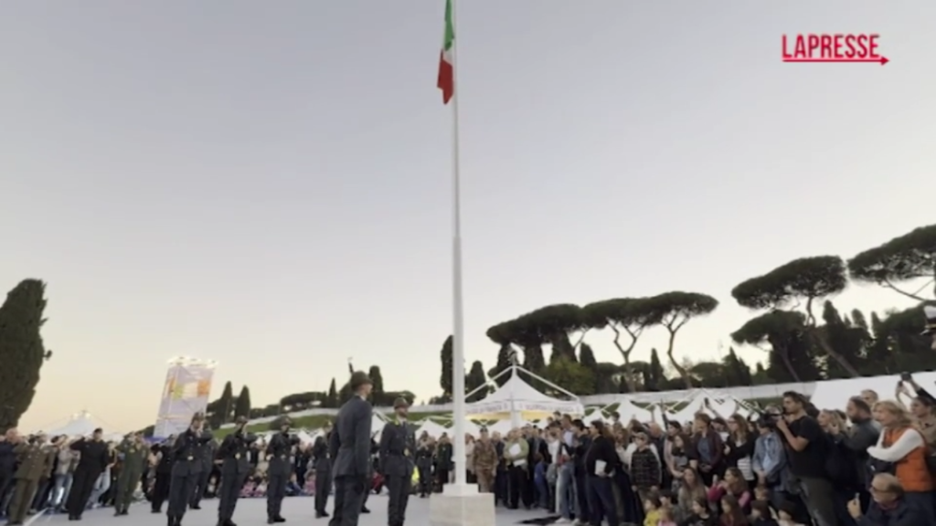 Cerimonia dell’ammaina bandiera al Villaggio della Difesa al Circo Massimo, a Roma. Dal primo al quattro novembre, infatti, nella Capitale è stato allestito un enorme spazio per celebrare la giornata dell’Unità nazionale e delle forze armate, che cade proprio il 4 novembre. Obiettivo del villaggio quello di avvicinare ai nostri militari, facendone conoscere da vicino le funzioni e i tanti ruoli svolti a sostegno della popolazione. Tanto calore e tanta vicinanza da parte dei moltissimi visitatori in occasione della cerimonia con cui viene calato giù il tricolore, salutato infine con un grande applauso da parte del pubblico che ha assistito alla cerimonia.