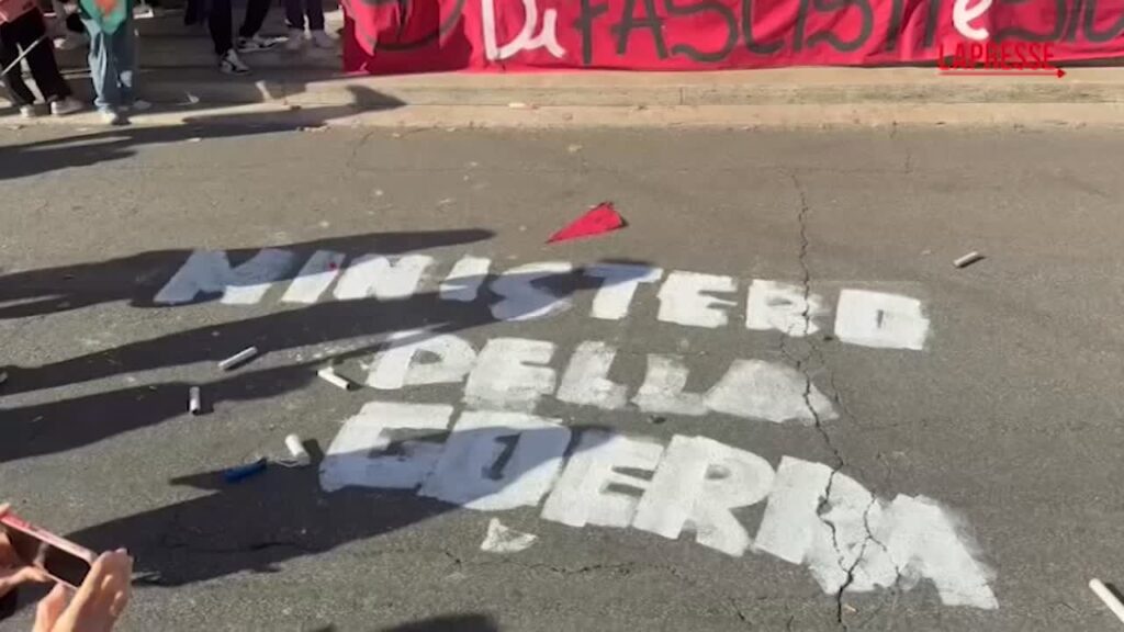 Al termine del corteo ‘No Meloni day’, partito da Piramide, a Roma, una volta arrivati al Ministero dell’istruzione e del merito gli studenti dei Collettivi Studenteschi Romani hanno lasciato per terra una scritta che recitava: ‘Ministero della guerra’. Gli studenti hanno manifestato la propria contrarietà alle politiche del ministro Valditara e della ministra Bernini, in particolar modo contro l’alternanza scuola lavoro. Cori, slogan e striscioni anche contro i tagli in Manovra, il DL sicurezza e la guerra in Palestina.