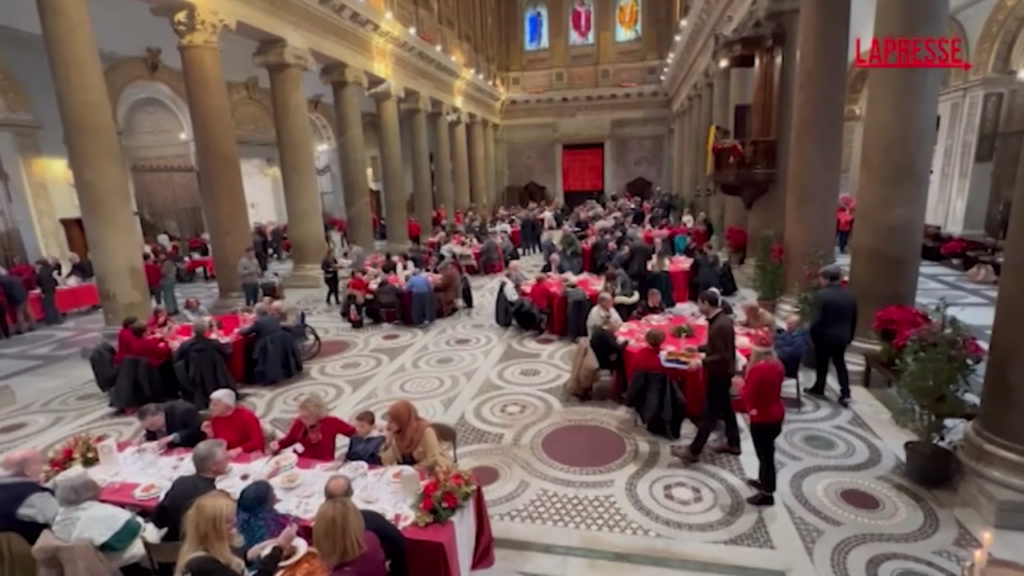 Come ogni anno torna il tradizionale pranzo natalizio con Sant’Egidio nella basilica si Santa Maria in Trastevere. Un appuntamento che si rinnova con la presenza del sindaco di Roma Roberto Gualtieri: “Dopo le parole di ieri del Papa all’apertura del Giubileo – ha detto Gualtieri – per noi è più forte l’impegno verso chi è in difficoltà”. Tra i tanti volontari che sono venuti qui a dare un mano per cucinare e apparecchiare anche Mahfud Haldaer, cittadino siriano giunto in Italia attraverso i canali umanitari gestiti da Sant’Egidio. “La situazione in Siria oggi è indecifrabile – ci racconta Mahfud, cristiano – io studiavo poi sono dovuto scappare in Libano dove sono rimasto due anni ma anche li la situazione per me non era rassicurante. Fortunatamente, attraverso la chiesa sono entrato in contatto con Sant’Egidio“. “Dopo l’apertura della Porta Santa in Vaticano – ha detto Marco Impagliazzo, presidente di Sant’Egidio – oggi si aprono le porte di Santa Maria in Trastevere, come in tutta Italia per accogliere persone più povere, senza dimora, anziani e immigrati che senza questo aiuto non potrebbero godere della gioia del Natale”