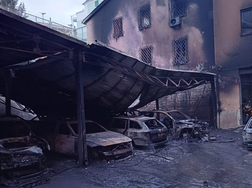Le fiamme hanno distrutto in pochi minuti quindici autoveicoli. Dieci erano auto di servizio della polizia, mentre le altre erano mezzi privati degli agenti. I momenti concitati dell’incendio divampato lunedì mattina ad Albano Laziale (Roma) un paio d’ore prima dell’alba nel parcheggio interno, comune al commissariato e della sottosezione della polizia stradale sono racchiusi nelle immagini di videosorveglianza interna, che hanno immortalato anche i presunti piromani. Il rogo è stato appiccato a pochi giorni di distanza da un altro episodio analogo, che ha interessato il comando della Compagnia dei carabinieri di Castel Gandolfo, dove sono rimasti intossicati anche due poliziotti. In entrambi i casi, una persona incappucciata dopo aver scavalcato il muro di cinta ha appiccato il rogo dando fuoco a un accelerante di combustione, forse ‘Diavolina’, dopo aver cosparso le gomme dei mezzi con materiale infiammabile, contenuto in una tanica che ha portato via durante la fuga. I residenti degli stabili intorno al commissariato sono stati fatti evacuare in via precauzionale.