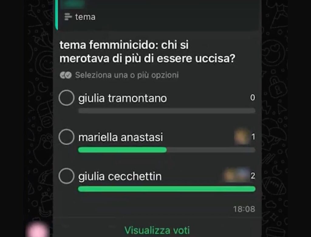 “Chi si meritava di più di essere uccisa?“, e tre opzioni tra le quali scegliere: Giulia Tramontano, Mariella Anastasi e Giulia Cecchettin. È il “sondaggio” creato in una chat di classe di una scuola superiore di Bassano del Grappa, in provincia di Vicenza. Il caso è stato reso noto da Women for freedom, associazione con sede a Bassano del Grappa impegnata nella difesa di donne e bambini in condizioni di emergenza. L’associazione ha anche pubblicato sui social network gli screenshot della chat nei quali si può leggere il macabro sondaggio creato da qualcuno dei partecipanti. “Non è solo una bravata di cattivo gusto o una battuta fuori luogo – sottolinea l’associazione – ma una mancanza totale di empatia. È uno specchio rotto in cui si riflette una parte della nostra società che ancora non capisce, o non vuole capire, quanto sia profonda la ferita del femminicidio. Giulia Cecchettin è stata uccisa con 75 coltellate. Aveva appena qualche anno più dei ragazzi che ora scherzano su tragedie come la sua. Aveva sogni, amici, una famiglia. Come li aveva Giulia Tramontano, incinta di sette mesi. Come li aveva Mariella Anastasi, bruciata viva. E non basta dire ‘sono ragazzi’, perché chi crea un sondaggio del genere sa benissimo che sta ferendo. Sta scegliendo di calpestare il dolore. Sta, in qualche modo, giocando con la morte degli altri. E chi risponde, chi ride, chi sta zitto… è parte del problema“.