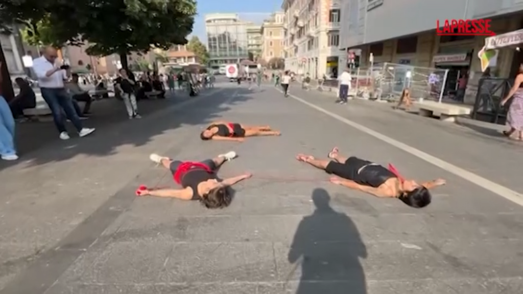 Flash mob contro i femminicidi delle militanti del gruppo femminista “Bruciamotutto” a Roma. Un gruppo di ragazze “armate” di filo rosso e i corpi segnati dai nomi delle donne vittime di femminicidio si è posizionata al centro di piazzale Flaminio, all’uscita della metro, urlando i nomi delle vittime. Le attiviste poi si sono sdraiate per terra, legate tra di loro con del filo rosso.