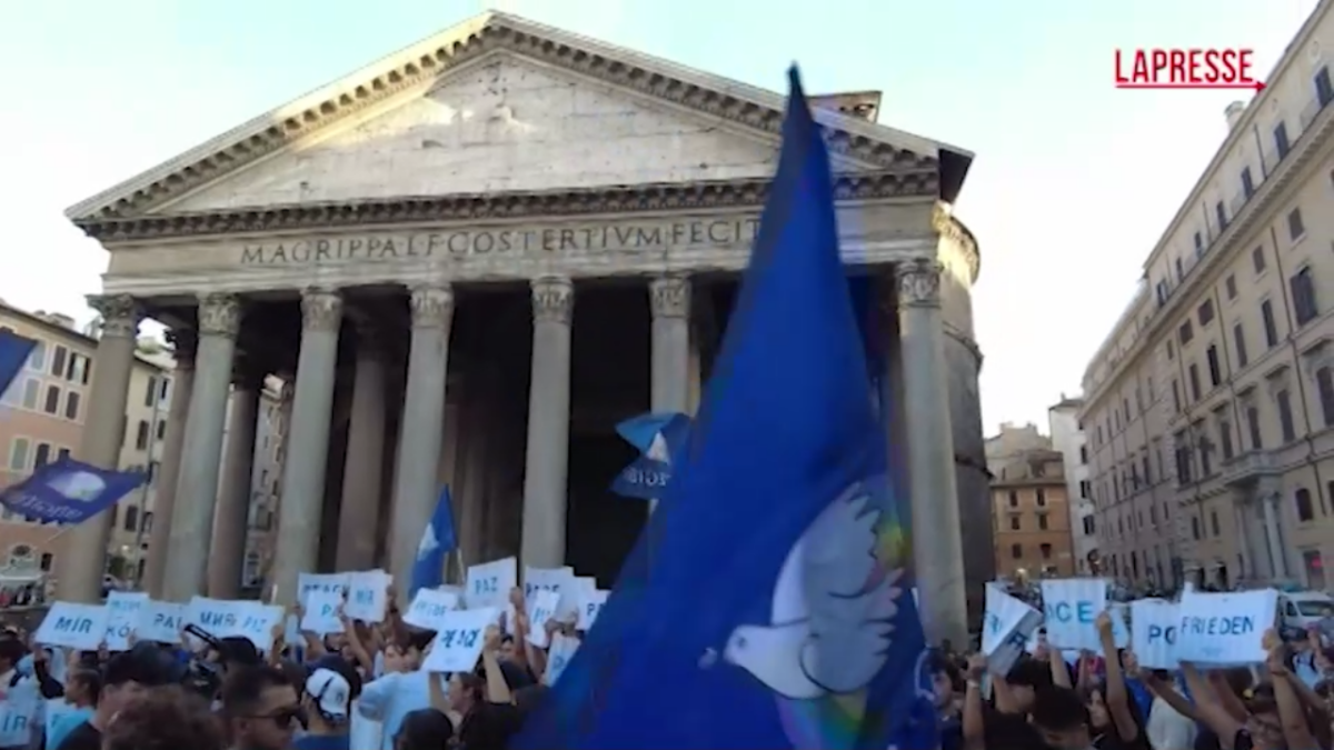 (LaPresse) Un’azione a sorpresa davanti al Pantheon a Roma per gridare in tutte le lingue del mondo la parola “Pace”. È l’iniziativa della comunità di Sant’Egidio che in questi giorni ha radunato oltre 1200 ragazzi da tutto il mondo per la tre giorni del “Global Friendship“, dedicato alla pace e all’amicizia tra i popoli. Nella piazza romana sempre affollata di turisti i giovani si sono presi il loro spazio cantando, ballando, suonando tamburi e alzando cartelli con la parla “Pace” scritta in inglese, ucraino, russo, francese, portoghese, italiano, arabo e in molte altre lingue del mondo. Dal microfono della piazza tante le testimonianze di giovani che sono stati costretti a scappare da luoghi di guerra e di oppressione come l’Ucraina o l’Afghanistan. “Una piazza che parla di pace. Abbiamo molto bisogno nelle nostre città di spazi in cui si possa parlare di pace” dice Anna, studentessa di Treviso che vive a Roma per studiare e che qui ha conosciuto la comunità. “E poi è una piazza di giovani perché siamo giovani e crediamo che il mondo abbia un futuro proprio se costruiamo la pace. Ci spaventa molto che guerre e violenza si stiano allargando anche in Europa che pensavamo fosse il continente libero dalla guerra anche per la lezione che la storia ci ha dato”.