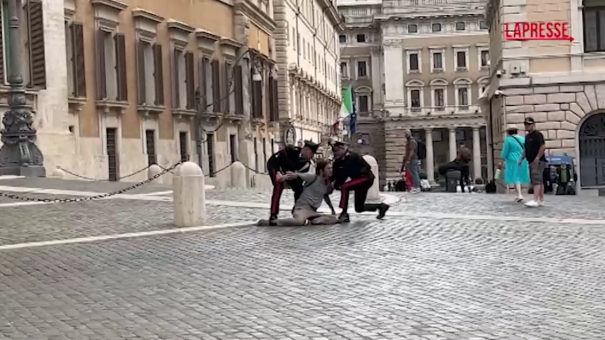Protesta in piazza Montecitorio di fronte alla Camera di Ultima Generazione contro la guerra a Gaza definita “un genocidio” e a sostegno della Global Sumud Flotilla, diretta verso la Striscia con un carico umanitario. Sei attivisti volevano incatenarsi di fronte all’ingresso del palazzo con bandiere della Palestina e sono stati trascinati via dai carabinieri.