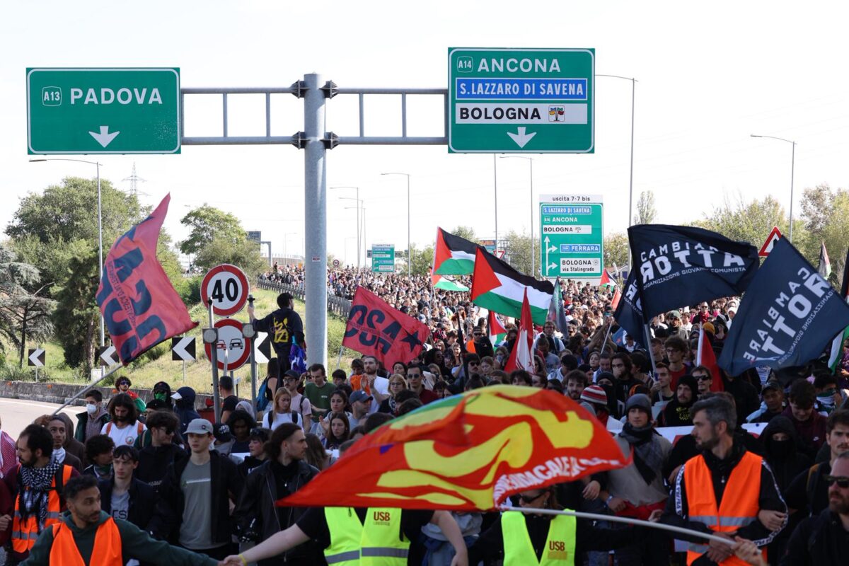 I partecipanti al corteo a sostegno della Global Sumud Flotilla sono entrati sulla Tangenziale, bloccandola entrando contromano all’uscita 7bis.Il corteo di più di 15.000 persone è partito alle ore 10 da Piazza Maggiore, è arrivato in via Stalingrado dove, alle ore 13 circa, all’altezza del Ponte, poco più avanti di via Calzoni hanno incontrato il blocco dei reparti schierati delle Forze dell’Ordine. C’è stato un primo tentativo di sfondare il blocco che è stato respinto con qualche spintone. Sono stati lanciati oggetti e alcune bottiglie all’indirizzo dei reparti.