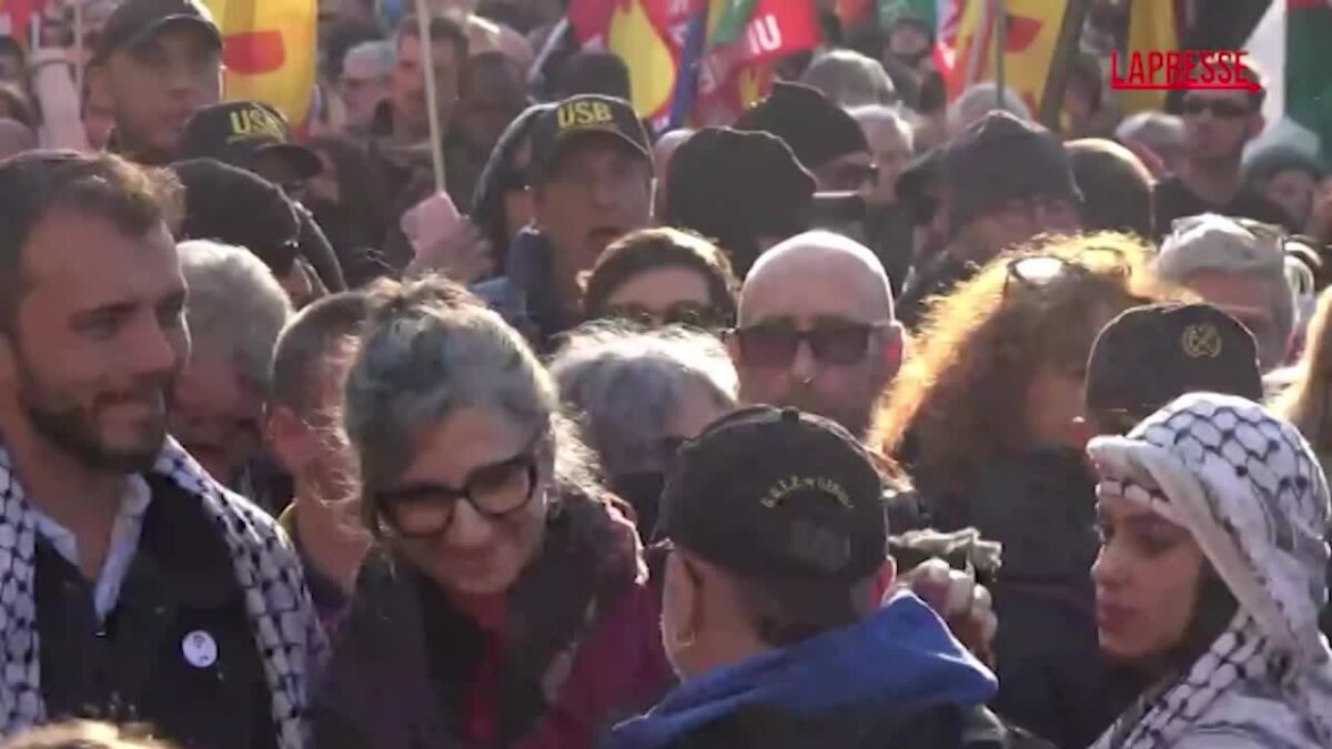 L’Unione sindacale di base scende in piazza a Roma per la manifestazione nazionale “contro la finanziaria di guerra” dopo lo sciopero generale di ieri. Decine di migliaia i manifestanti. Come alla manifestazione di Genova di ieri anche nel corteo di Roma l’attivista Greta Thunberg è scesa in piazza assieme alla Relatrice speciale Onu per i territori palestinesi occupati Francesca Albanese. Thunberg e Albanese in testa al corteo con i Vigili del Fuoco a fare da cordone di solidarietà. In piazza anche Unione Democratica Arabo-Palestinese, Potere al Popolo, Cambiare Rotta e Osa. In testa al corteo anche una delegazione di ebrei newyorchesi della “Jews United Against Zionism”. I lavoratori del porto di Genova del Calp hanno accompagnato Thunberg anche alla manifestazione di venerdì e all’incontro di sabato mattina a Roma Tre con Albanese. Tante le bandiere della Palestina a sfilare in corteo e anche alcune del Venezuela dopo il recente precipitare dei rapporti tra il paese latino e gli Usa. Un corteo “per dire no al bellicismo ed alle politiche di riarmo, la fine di ogni complicità con Israele e del genocidio in Palestina” partito da Piazzale Ostiense e diretto a Piazza San Giovanni passando per il Colosseo. Tanti gli striscioni contro il governo israeliano ma anche contro quello italiano con Meloni e ministri accusati di complicità nel genocidio.