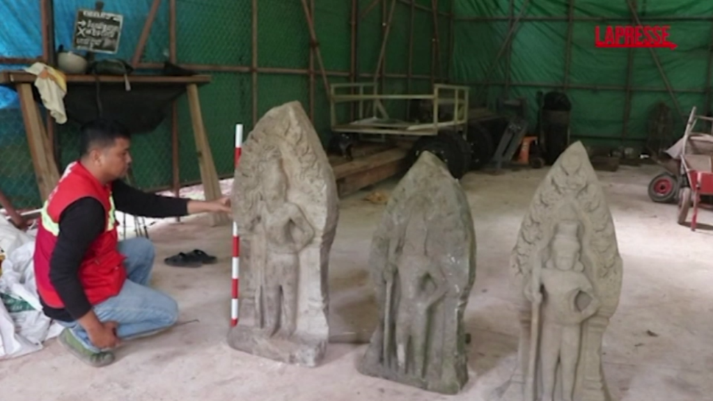 In Cambogia alcuni archeologi hanno portato alla luce una dozzina di antiche statue in pietra arenaria nel sito di Angkor, patrimonio dell’umanità Unesco, vicino alla città di Siem Reap. Le statue – i cosiddetti ‘guardiani delle porte’ – sono state scoperte la scorsa settimana vicino alla porta nord che conduce al Palazzo Reale dell’XI secolo di Angkor Thom, l’ultima capitale dell’Impero Khmer. Long Kosal, portavoce dell’Autorità nazionale Apsara, l’agenzia governativa che sovrintende al parco archeologico, ha dato l’annuncio mercoledì. Le statue sono state scoperte mentre le squadre valutavano la struttura dell’antica porta e cercavano pietre cadute intorno al portale sul lato nord di Angkor Thom, uno dei quattro ingressi al complesso. Lo scavo archeologico è stato un progetto di collaborazione tra Apsara e il China-Cambodia Government Team for Safeguarding Angkor, ha dichiarato Apsara. Le statue raffigurano guardiani sull’attenti e hanno dimensioni che variano da 1 metro a 110 centimetri. L’archeologo Sorn Chanthorn ha riferito che sono state trovate sepolte a una profondità massima di 1,4 metri e alcune sono in condizioni sorprendentemente buone, con ornamenti unici per i capelli che ne accrescono la particolarità. “Gli esperti ritengono che queste statue di guardiani delle porte esemplifichino lo stile Khneang, allineandosi al periodo di costruzione del palazzo dell’XI secolo“, ha dichiarato l’Autorità nazionale Apsara.