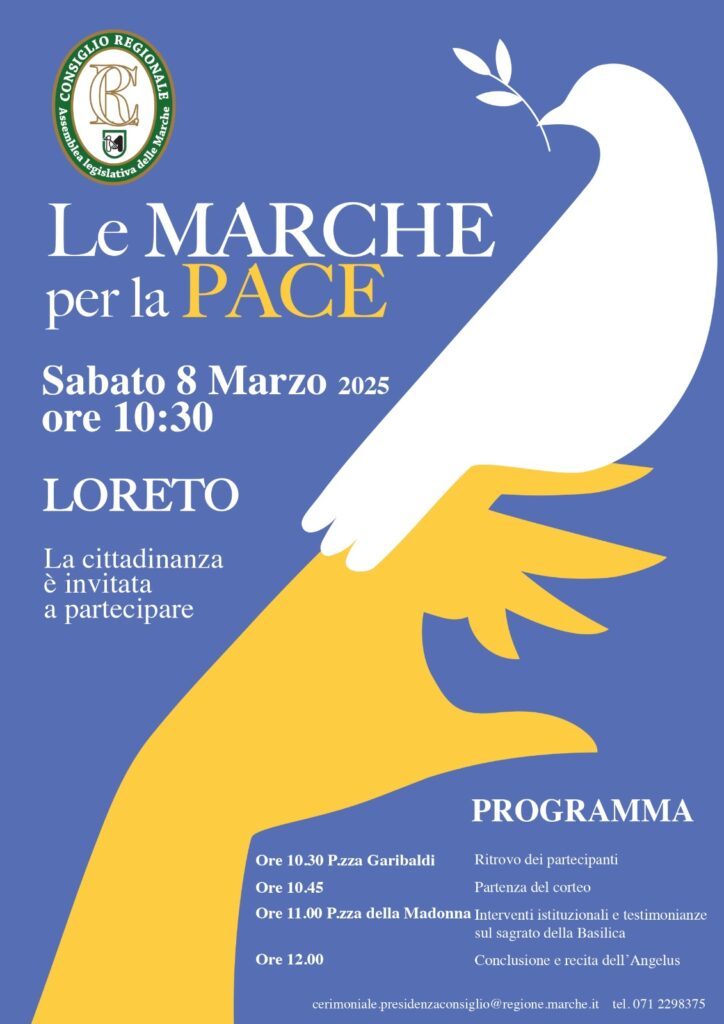 E’ in programma una nuova edizione della manifestazione dal titolo ‘Le Marche per la pace’, organizzata dal Consiglio regionale delle Marche per sabato 8 marzo a Loreto (Ancona). Lo svolgimento dell’iniziativa ricalcherà il programma delle precedenti edizioni, con il ritrovo alle 10.30 in piazza Garibaldi e la partenza del corteo fino a piazza della Madonna, dove ci saranno gli interventi dei rappresentanti delle istituzioni e dell’Ufficio scolastico regionale, alcune testimonianze e la recita dell’Angelus per la pace. “Un occasione per riflettere e sensibilizzare la comunità marchigiana sui conflitti mondiali in corso” dice Dino Latini, presidente del Consiglio regionale che promuove l’iniziativa. Sono stati invitati a partecipare i sindaci delle Marche con i gonfaloni del Comuni che rappresentano, insieme ai presidenti delle Province marchigiane, il presidente della Giunta regionale, assessori e consiglieri regionali, i parlamentari marchigiani, il presidente di Anci Marche, le autorità pubbliche e religiose, le associazioni del terzo settore che si occupano di volontariato, la promozione della pace. Anche per questa edizione è attesa l’ampia partecipazione degli studenti degli istituti scolastici.