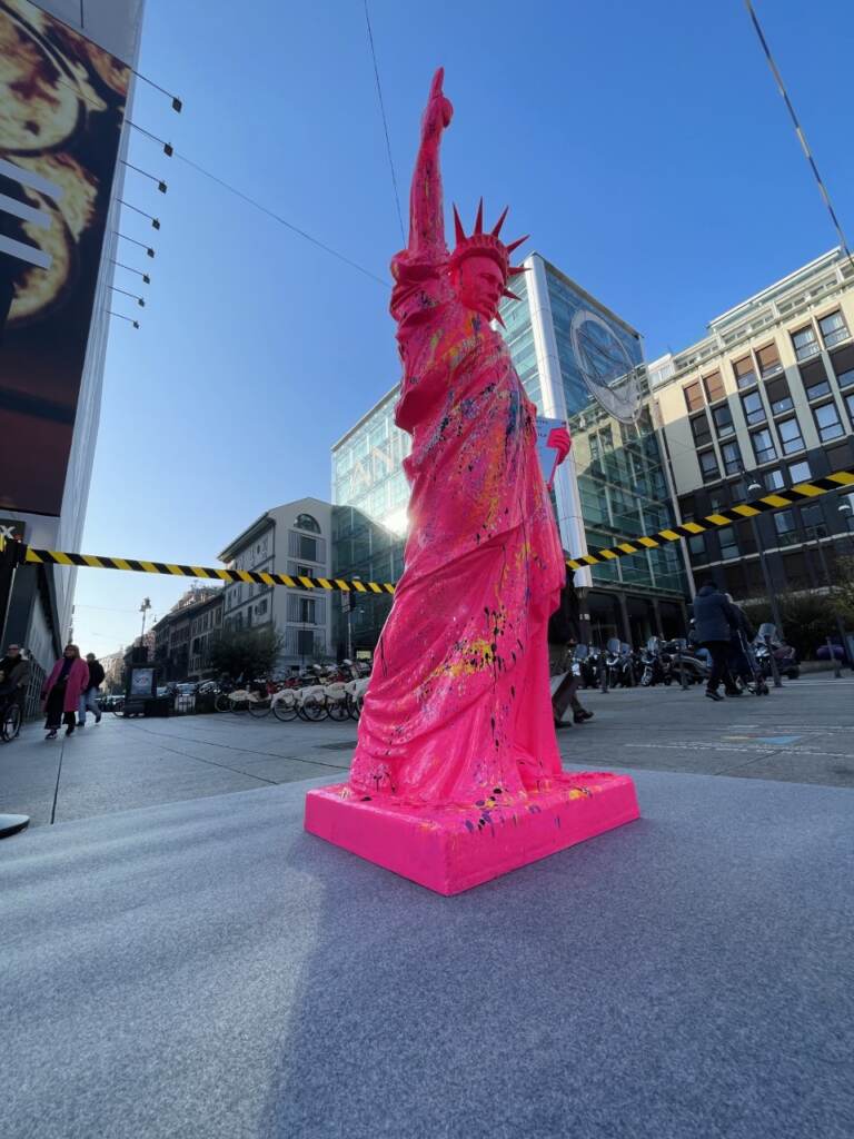 Milano come New York. In zona Moscova, al centro di largo La Foppa, è infatti comparsa una statua misteriosa alta oltre 2 metri e 50 raffigurante la Statua della Libertà, simbolo della Grande Mela e degli Stati Uniti, di colore fucsia con macchie di vernice lungo tutta la tunica e non solo. C’è un dettaglio particolare: al posto della Dea Ragione, compare il volto di Vladimir Putin, mentre al posto della fiaccola la mano destra della statua tiene una pistola puntata verso il cielo.