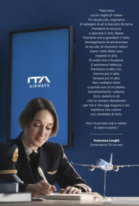 ITA Airways celebra la Festa della Donna con “un’iniziativa dedicata ai sogni, alle ambizioni e alla determinazione delle donne nel raggiungere gli obiettivi della vita” scrive la Compagnia di bandiera in un comunicato stamattina. Nella campagna e omaggio di ITA, testimonial d’eccezione è il Comandante Francesca Longhi, la prima donna ad aver superato i nuovi Corsi Comando della Compagnia passando da pilota all’ambita carica di Comandante.