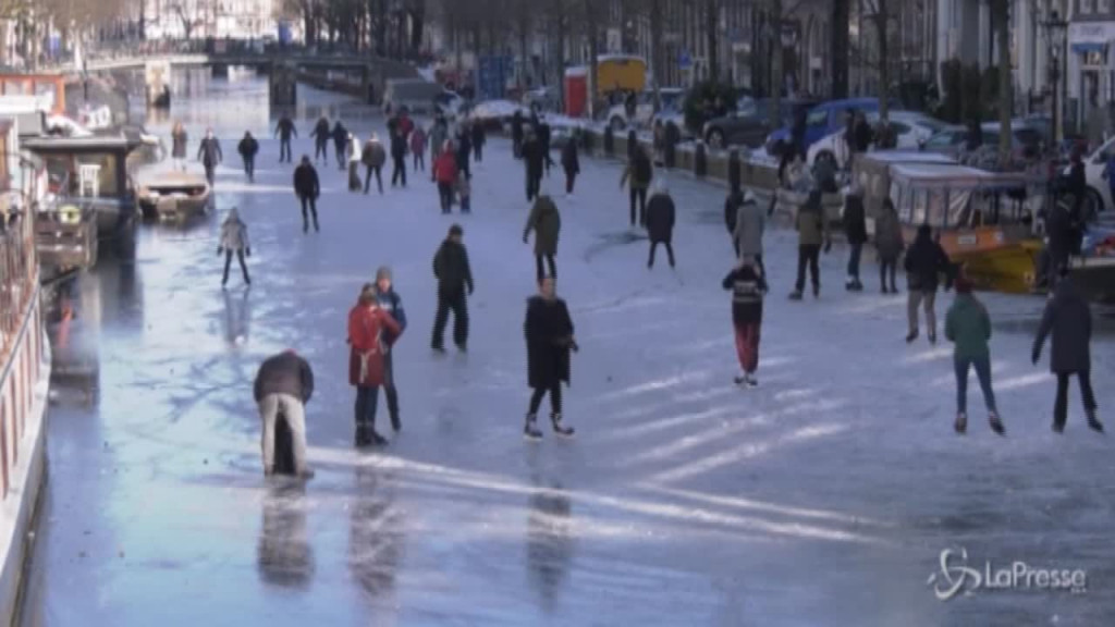 I canali di Amsterdam trasformati in piste di pattinaggio. E decine di perone ne hanno approfittato per divertirsi lungo lo storico canale Prinsengracht, il Canale del Principe.