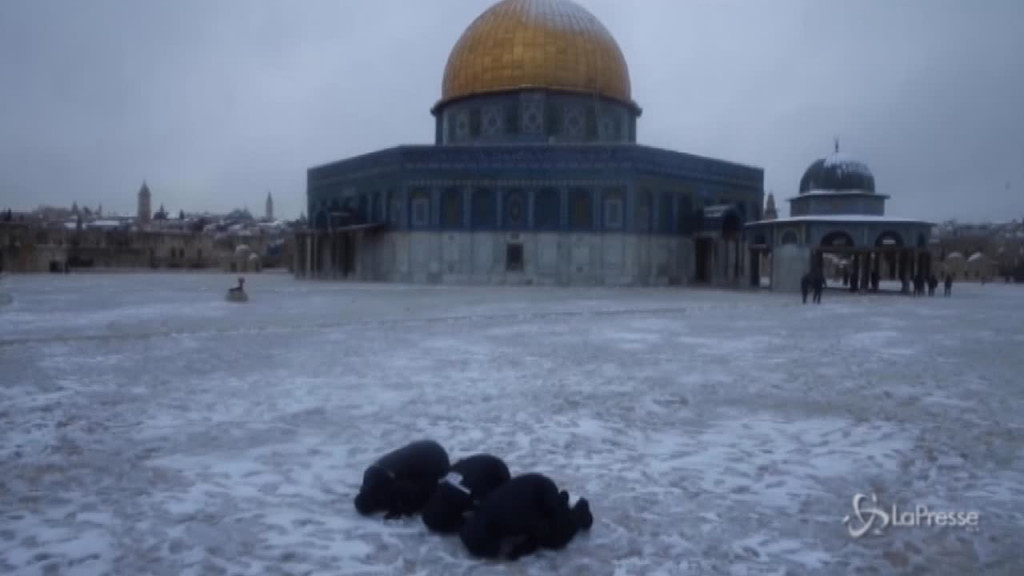 (LaPresse) La famosa cupola d’oro della Moschea della Roccia, a Gerusalemme, imbiancata dalla neve. Alcuni fedeli pregavano fuori dalla Cupola della Roccia, mentre altre persone giocavano sulla neve sulla spianata sacra o costruivano un pupazzi di neve. Mercoledì, dopo anni, la neve è caduta in aree come alcune zone della Siria, del Libano, della Giordania e della Cisgiordania.