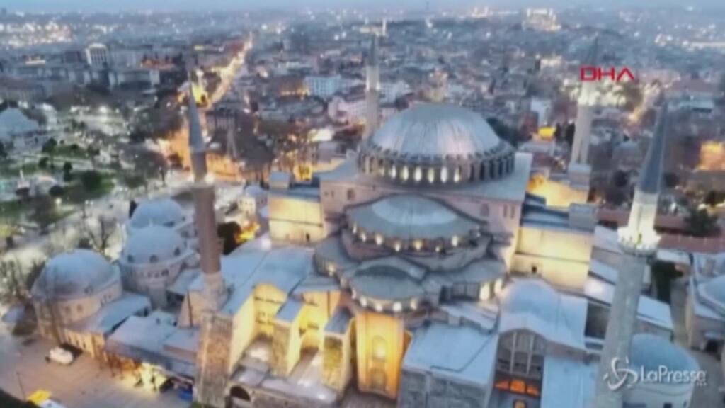 (LaPresse) La chiamata alla preghiera nella Basilica di Santa Sofia, a Istanbul, ha segnato la fine del primo giorno di digiuno durante il Ramadan, il mese sacro dell’Islam. È la prima volta che la Basilica viene utilizzata per le preghiere del Ramadan dopo che a luglio dello scorso anno il presidente turco Recep Tayyip Erdogan ha convertito formalmente Santa Sofia in moschea poche ore dopo che un’alta corte aveva annullato una disposizione del 1935 che l’aveva resa un museo. Il Ramadan è un periodo di preghiere, digiuno dall’alba al tramonto e feste notturne con la famiglia e gli amici, sebbene in Turchia le riunioni affollate nelle moschee siano state scoraggiate a causa della pandemia. Durante il periodo sacro, i musulmani si astengono da qualsiasi cibo o bevanda, inclusa l’acqua, dalla mattina alla sera.