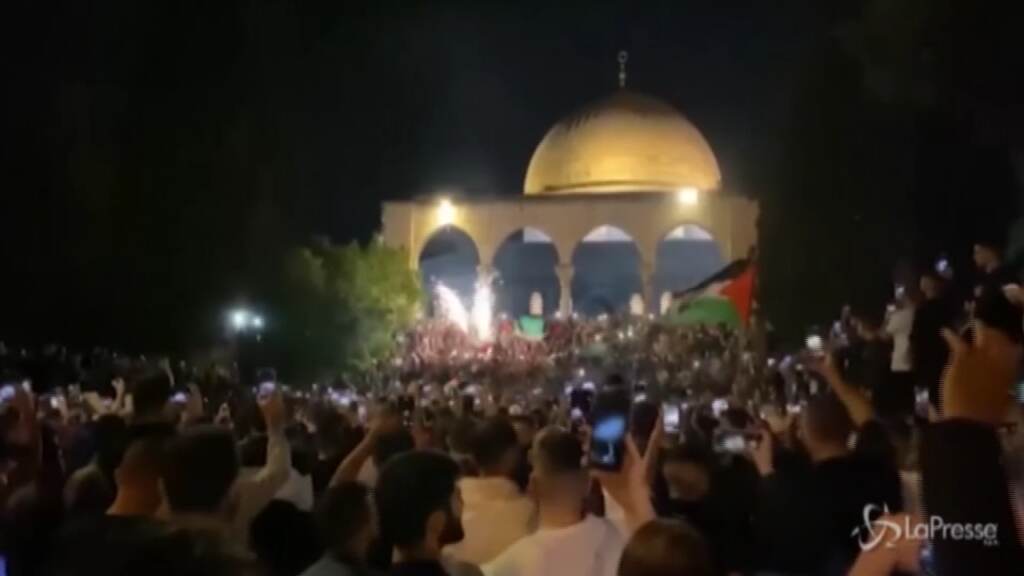 (LaPresse) I palestinesi festeggiano davanti alla Moschea di Al-Aqsa, nella città vecchia di Gerusalemme, la tregua raggiunta tra Hamas e Israele dopo 11 giorni di combattimenti. Nella notte è scattato il cessate il fuoco da entrambe le parti. Festa anche per le strade di Gaza.