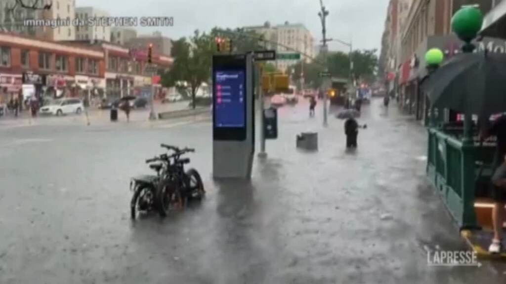 Le strade e le stazioni della metropolitana di New York, nella parte superiore di Manhattan, allagate dopo i forti temporali provocati dalla tempesta tropicale Elsa. Alcune persone hanno camminato per la città immersi nell’acqua fino alla vita mentre diverse auto sono rimaste bloccate tra le vie che sembravano fiumi in piena.