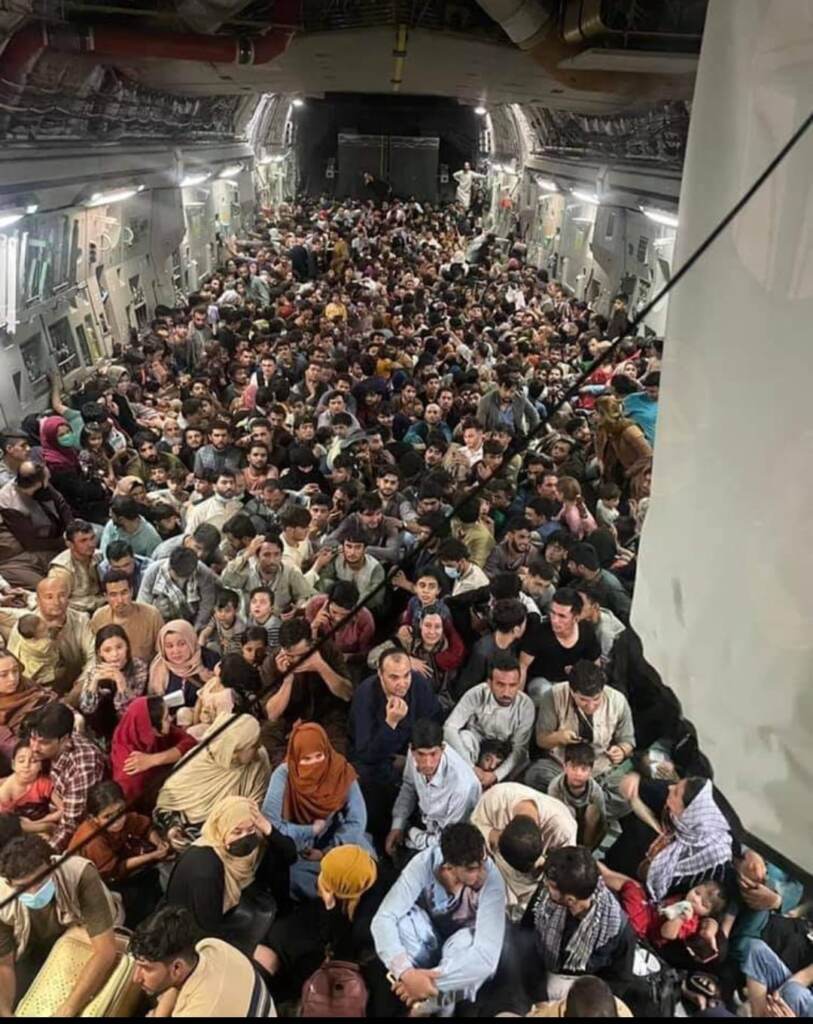Centinaia di afghani stipati a bordo di un volo dell’aereonautica militare americana in fuga da Kabul: è lo scatto, pubblicato da Defense One, diventato ormai simbolo della presa di Kabul da parte dei talebani. L’aereo, un C-17 Globemaster, è decollato dalla capitale dell’Afghanistan diretto verso il Qatar evacuando oltre 600 cittadini dopo i disordini all’aereoporto della città.