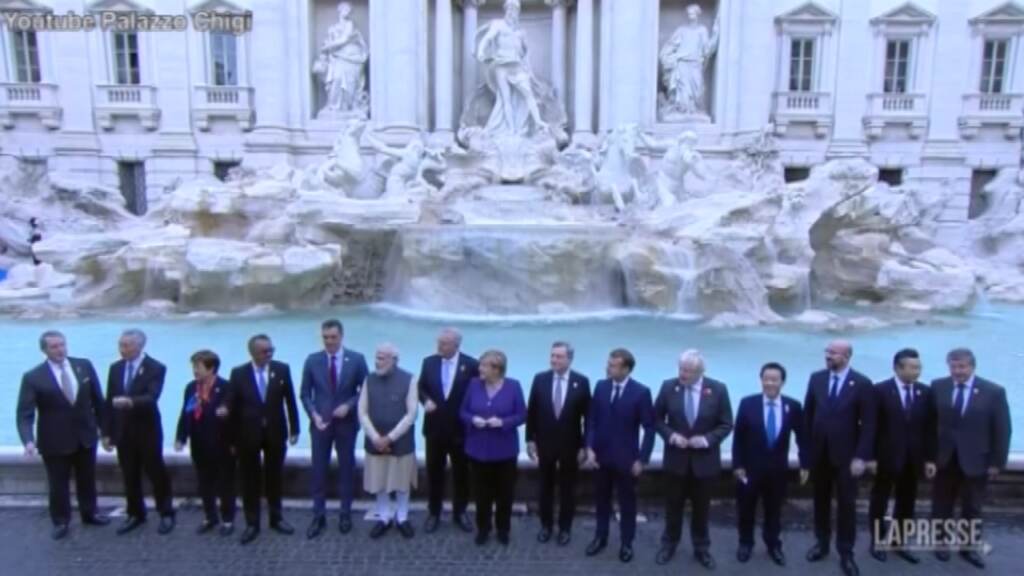 Passeggiata a Fontana di Trevi per Mario Draghi e i leader del G20. A palazzo Poli i grandi della Terra hanno ricevuto un sacchetto con dentro un euro italiano, con inciso l’Uomo Vitruviano, simbolo del summit capitolino. I venti grandi hanno poi lanciato la monetina nella fontana, come da tradizione, con le spalle rivolte al celebre monumento romano in segno beneaugurante. Numerosi i curiosi affacciati alle finestre dei palazzi per assistere alla scena mentre il clima tra i leader è apparso disteso e rilassato. Siparietto tra Merkel e Draghi con il premier italiano che ha invitato la cancelliera a posizionarsi al suo fianco per la foto di famiglia.