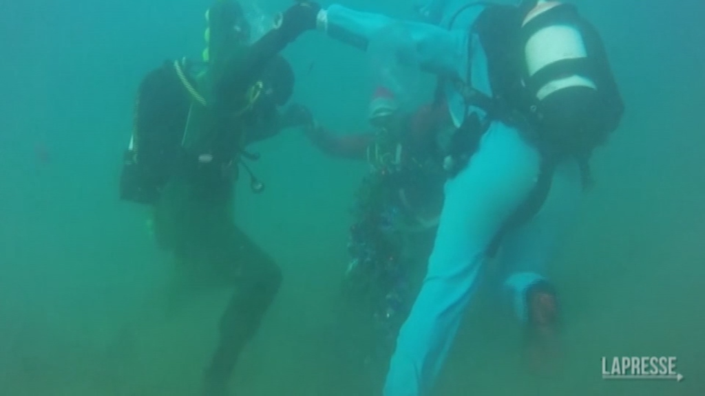 Un team di subacquei vestiti da Babbo Natale ha installato un albero, addobbato con decorazioni natalizie e palline, sul fondo del Mar Nero, al largo della costa della Crimea. Vestiti con costumi festosi, i sub si sono immersi in acqua per “piantare” l’albero a una profondità di 10 metri.