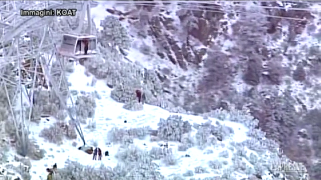 (LaPresse) La formazione di ghiaccio su un cavo ha bloccato due vagoni di una funivia sui Monti Sandia, nei pressi di Albuquerque, nello Stato americano del Nuovo Messico. A bordo si trovavano 21 persone, rimaste sospese per una notte. Un portavoce dei Vigili del Fuoco della Contea di Bernalillo ha riferito che 20 persone in un vagone sono state salvate nel primo pomeriggio di sabato e che una persona, a bordo del secondo vagone, è stata tratta in salvo diverse ore dopo. Il portavoce ha affermato che le persone erano tutte dipendenti della Sandia Peak Aerial Tramway o di un rifugio in cima a una montagna. Non sono stati segnalati feriti.