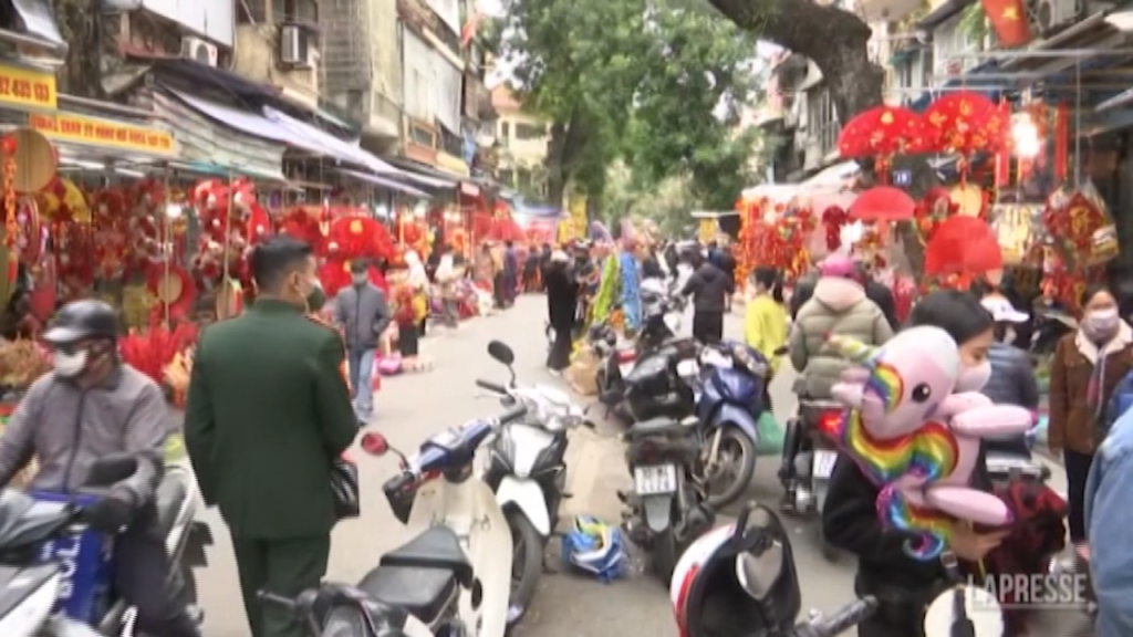 I vietnamiti si preparano per il Capodanno Lunare, la festività più importante dell’anno nel paese, che cade martedì 1 febbraio, e segna un periodo di vacanze. Le strade della capitale Hanoi sono decorate con festoni e gli abitanti fanno shopping nei negozi e nelle bancarelle del centro. Hanoi, che conta 8 milioni di abitanti, ha allentato le restrizioni Covid da ottobre, quando sono calati i casi ed è aumentato il numero di vaccinati.