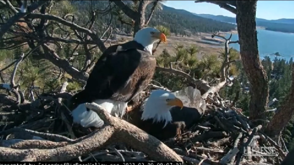 (LaPresse) Dovrebbero schiudersi per la fine di febbraio le due uova di aquila di mare testabianca che una coppia di esemplari sta curando con grande attenzione vicino al lago Big Bear, nelle montagne della California meridionale. Il nido si trova su un pino a 44 metri da terra. A documentare la straordinaria covata le immagini in streaming di Friends of Big Bear Valley. Il primo uovo è stato deposto il 22 gennaio, il secondo, tre giorni dopo. L’anno scorso la stessa coppia aveva deposto altre due uova, ma nessuno dei due pulcini è sopravvissuto.