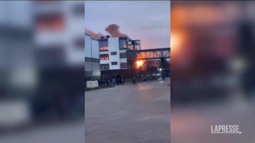 (LaPresse) Diffuse sui social alcune immagini che mostrano un’esplosione nei pressi dello aeroporto di Ivano-Frankivsk dopo l’arrivo di un missile. Un’alta colonna di fumo si alza in cielo dopo l’esplosione. DISTRIBUTION FREE OF CHARGE
