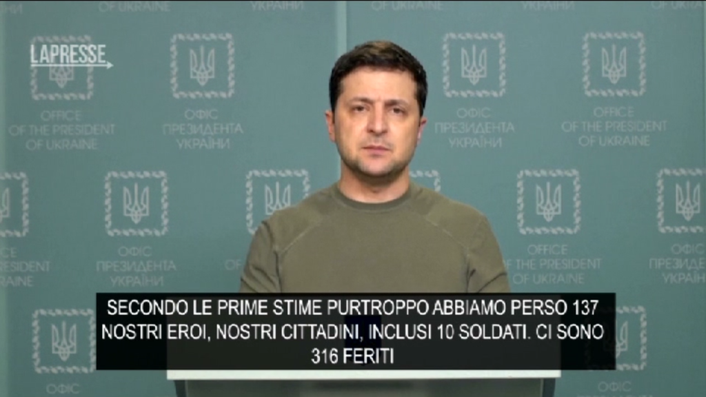 (LaPresse) – Il presidente ucraino Volodymyr Zelensky ha diffuso un video in cui ha annunciato: “Secondo le stime preliminari oggi abbiamo perso 137 nostri eroi, inclusi 10 ufficiali. In 316 sono rimasti feriti”. Il capo dello Stato poi ha invitato la Russia a parlare con Kiev “per mettere fine all’invasione”. “Io sono l’obiettivo numero uno, la mia famiglia il numero due, ma io resto qui con la mia gente”, ha chiarito.