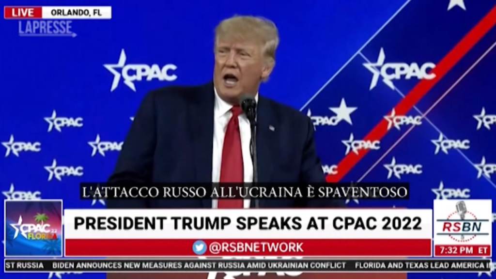 (LaPresse) L’ex presidente degli Stati Uniti Donald Trump ha parlato della situazione in Ucraina definendo l’attacco russo come “una atrocità che non doveva verificarsi” e ha descritto il presidente russo Vladimir Putin come “intelligente”. Trump è interventuo ad un incontro alla Conservative Political Action Conference . “Certo che Putin è intelligente, il problema vero è che i nostri leader sono stupidi”, ha aggiunto.