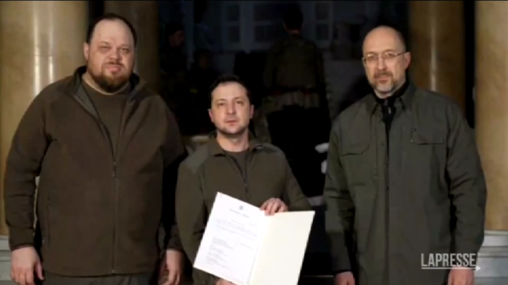 (LaPresse) Il presidente dell’Ucraina Volodymyr Zelensky ha firmato una richiesta di adesione dell’Ucraina all’Unione europea. Andrii Sybiha, capo dell’ufficio di Zelensky, ha dichiarato sulla sua pagina Facebook ufficiale che i documenti “stanno arrivando a Bruxelles”. Nelle fotografie e nei video diffusi a proposito della firma, a fianco di Zelensky si vedono il primo ministro Denys Shmyhal e il presidente del parlamento Ruslan Stefanchuk.