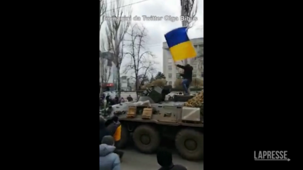 A Kherson continuano le manifestazioni dei cittadini contro l’occupazione russa dopo che la città è stata occupata dale forze di Mosca. Un dimostrante è salito su un tank russo per sventolare la bandiera ucraina.