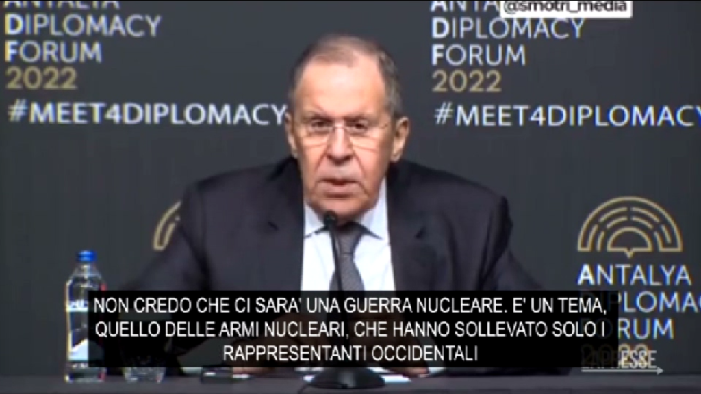 (LaPresse) “Non credo che ci sarà una guerra nucleare. È un tema, quello delle armi nucleari, che hanno sollevato solo i rappresetnanti occidentali. Come viene in mente una cosa del genere?”. Lo ha detto il ministro della difesa russo Sergei Lavrov, al termine dei colloqui in Turchia con il suo omologo ucraino Dmytro Kuleba. “Guerra nucleare è un termine usato solo dall’Occidente e da Stoltenberg senza consultare gli altri membri dell’Alleanza”, ha affermato.
