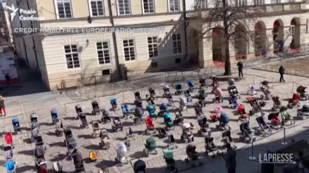 (LaPresse) Sono 109 i passeggini che sono stati posizionati in una piazza di Lviv (Leopoli) in Ucraina venerdì, come protesta per mostrare il numero di bambini morti nel conflitto dall’invasione della Russia nel Paese. La dimostrazione è avvenuta nel giorno in cui fuori Lviv è stato colpito un aeroporto e mentre le truppe russe avanzano nel Paese. CREDIT: RADIO FREE EUROPE/RADIO LIBERTYV