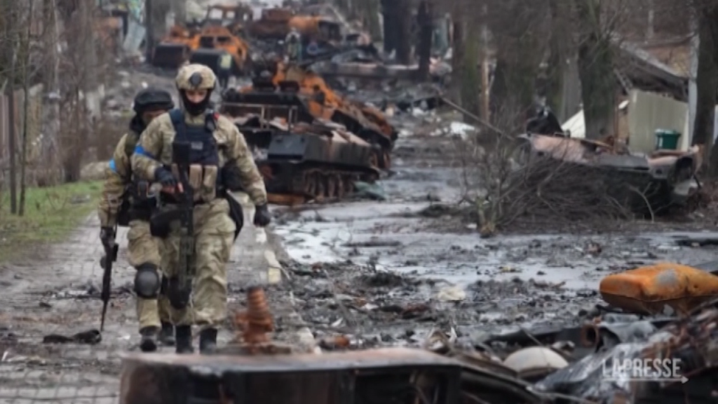 (LaPresse) Le strade della città di Bucha, nel nord dell’Ucraina, disseminate di mezzi bruciati dell’equipaggiamento militare russo. La città, alla periferia della capitale, Kiev, è stata sotto il controllo dei soldati russi per circa un mese. Dopo aspri combattimenti, i soldati ucraini hanno ripreso il controllo dell’area. L’esercito ucraino ha spiegato di aver trovato diversi corpi di vittime civili, alcuni con le mani legate e con segni di tortura.