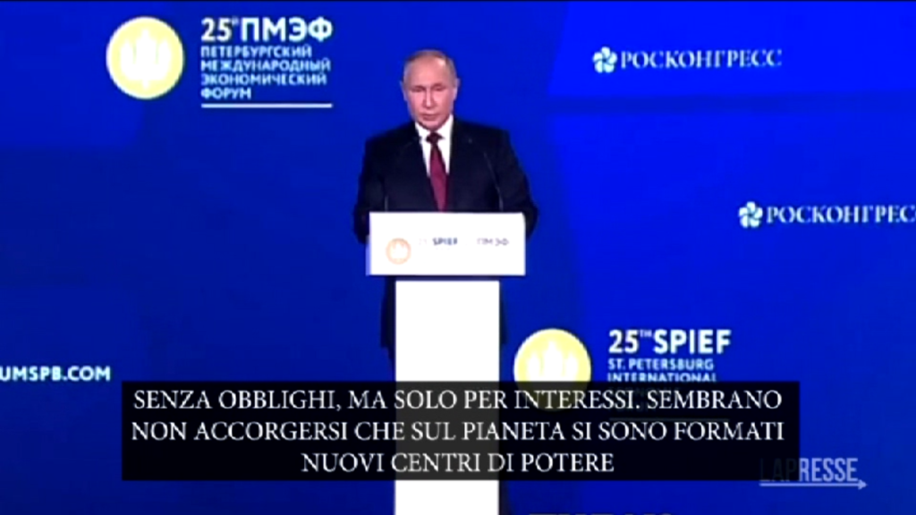 (LaPresse) Affondo contro gli Stati Uniti di Vladimir Putin al al Forum economico internazionale di San Pietroburgo: ” Dopo aver dichiarato la vittoria nella Guerra fredda, gli Stati Uniti si sono assunti il ruolo di messaggeri di dio, senza obblighi ma solo per interessi. Non si stanno accorgendo che i centri di potere sono cambiati”, ha spiegato il capo del Cremlino aggiungendo: “I cambiamenti nel mondo sono cruciali e inesorabili. Non si può aspettare che tutto torni alla normalità”.