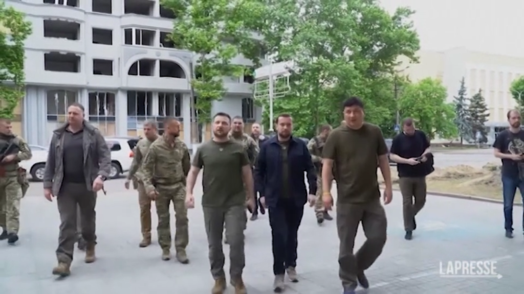 Il presidente dell’Ucraina, Volodymyr Zelensky, a Mykolaiv, sulla costa del Mar Nero. Una visita, quella del leader di Kiev, a poche ore dall’ultimo bombardamento russo sulla città. Colpiti alcuni grattacieli residenziali, almeno due i morti.