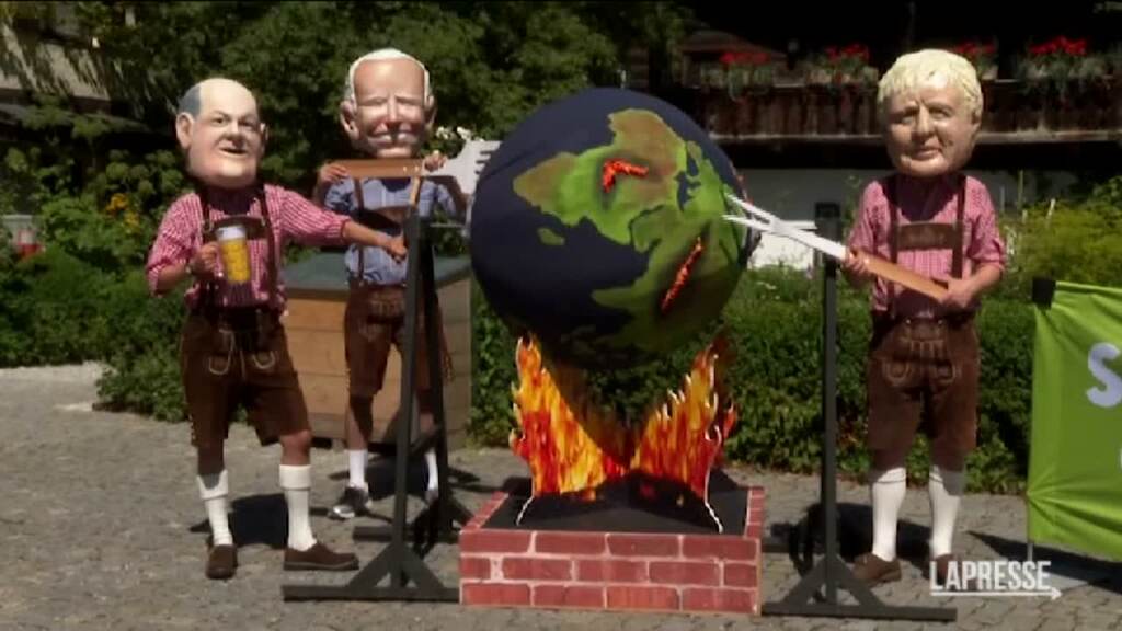 La crisi climatica al centro di una protesta messa in atto in una piazza della città di Garmisch-Partenkirchen, vicino alla sede del vertice del G7. Con indosso gli abiti tradizionali bavaresi ed enormi teste che ricordano quelle del presidente Usa Joe Biden, del cancelliere tedesco Olaf Scholz e del premier britannico Boris Johsonn e altri leader, gli attivisti hanno finto di “arrostire” il pianeta Terra su un girarrosto. “Ci aspettiamo un chiaro segnale che i leader rispettino gli impegni assunti con l’accordo di Parigi e apportino chiari miglioramenti in materia di protezione del clima”, ha dichiarato Charlotte Becker del gruppo Oxfam. L’ONG chiede anche una tassa sui profitti in eccesso guadagnati durante la pandemia di coronavirus, denaro dovrebbe essere utilizzato per combattere la povertà e la fame in tutto il mondo. La polizia ha schierato migliaia di agenti intorno alla sede del vertice nel villaggio bavarese di Elmau, nella vicina Garmisch-Partenkirchen e a Monaco.