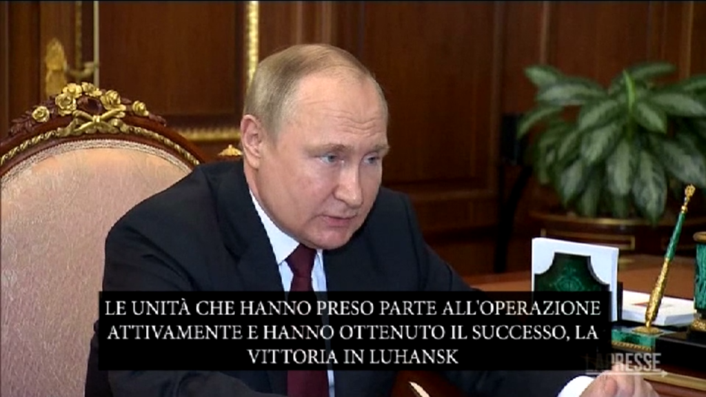 “Le formazioni militari” devono “portare avanti i loro incarichi secondo i piani precedentemente approvati. Mi auguro che tutto andrà nella direzione giusta come è avvenuto finora nel Luhansk”. Così il presidente russo, Vladimir Putin, parlando durante un incontro con il ministro della Difesa, Sergey Shoigu. Le unità dell’esercito russo “che hanno preso parte nelle ostilità attive e hanno ottenuto il successo, la vittoria” nel Luhansk, nell’est dell’Ucraina, “dovrebbero riposare e aumentare le loro capacità di combattimento”, ha aggiunto Putin.