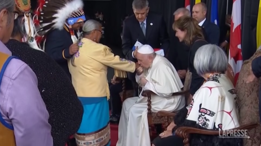 “Il mio viaggio in Canada è un pellegrinaggio penitenziale”. Lo ha sottoloineato Papa Francesco ai giornalisti presenti sul volo che lo ha portato oltre Oceano. “Stiamo attenti in questo viaggio: è un viaggio penitenziale, facciamolo con questo spirito”. All’arrivo poi, il Santo Padre, ha baciato la mano di Alma Desjarlais, sopravvissuta alla scuola residenziale della First Nation di Frog Lake, nel ruolo di capo Greg Desjarlais.