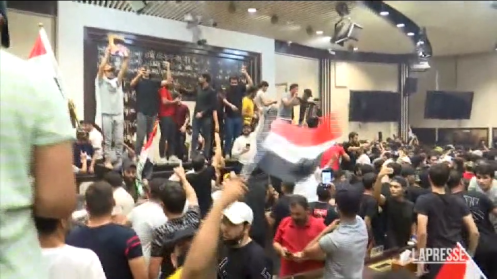 (LaPresse) Centinaia di manifestanti iracheni hanno fatto irruzione nel Parlamento di Baghdad mercoledì, intonando cori contro l’Iran, per una manifestazione contro il candidato a primo ministro di Mohammed al-Sudani, promosso dai partiti sostenuti dall’Iran. Nelle immagini si vedono i manifestanti, tutti uomini, camminare sui tavoli del Parlamento, sfogliare cartelle, sedersi sulle sedie dei legislatori e sventolare bandiere irachene. La maggior parte dei manifestanti erano seguaci dello sciita Muqtada al-Sadr: la situazione si è risolta senza incidenti proprio quando al-Sadr ha scritto sui social ai suoi seguaci di tornare tranquillamente alle vostre case”, segnalando che non ci sarebbe stata un’ulteriore escalation del sit-in. È stata la più grande protesta da quando si sono tenute le elezioni federali in ottobre.