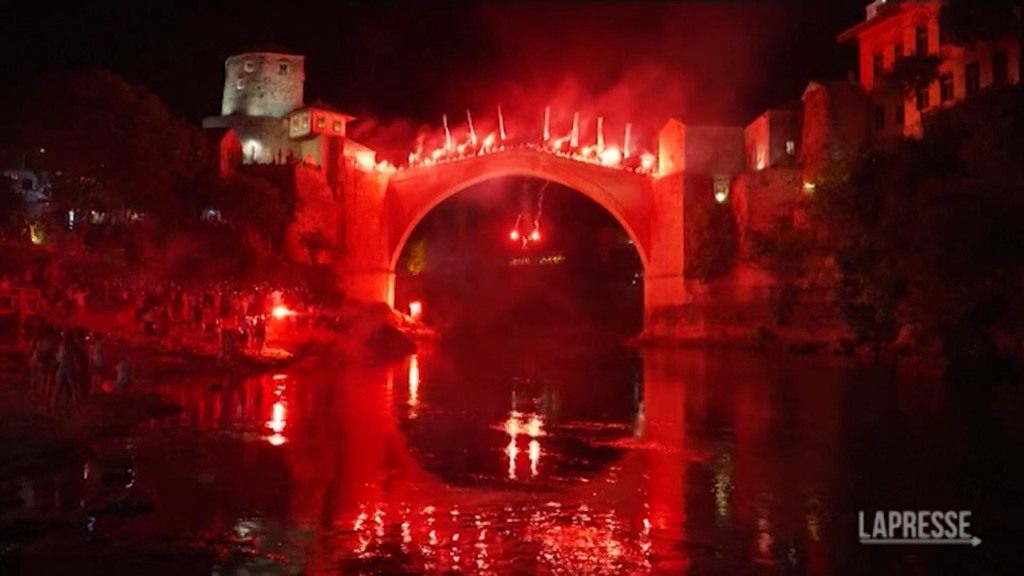 Musica in sottofondo, torce accese a illuminare la notte. Nel buio di domenica sera a Mostar alcuni atleti si sono lanciati dal ponte alto 23 metri per lo spettacolare evento che ha chiuso la 456esima edizione della gara di tuffi della città bosniaca. I tuffi in notturna non fanno parte della competizione ma sono solo un’esibizione che chiude il weekend. I tuffi dal ponte di Mostar, costruito originariamente dagli Ottomani nel 1566, sono stati un rito di passaggio per generazioni di giovani. Il Ponte Vecchio era stato distrutto durante la guerra interetnica in Bosnia del 1992-95, ma è stato faticosamente ricostruito dopo il conflitto con una replica esatta della struttura originale.