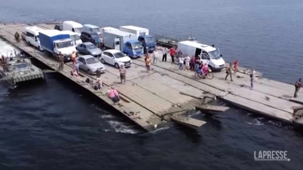 La TV di Stato russa ha condiviso un filmato che mostra quelli che, a suo dire, sono residenti ucraini che utilizzano un traghetto per attraversare il fiume Dnepr. Il passaggio improvvisato ha sostituito un ponte colpito dalle forze di Kiev. La TV di Stato russa ha dichiarato che i militari di Mosca stanno aiutando la popolazione locale con consegne di cibo. Sul traghetto c’è spazio per 20 auto e che il tempo di viaggio per attraversare il fiume è di circa 10 minuti.