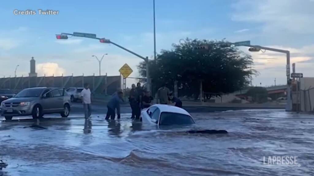 Una donna è stata estratta viva dalla sua auto che stava sprofondando in una profonda voragine. È successo a El Paso, in Texas, negli Stati Uniti. Poco dopo il provvidenziale intervento dei soccorritori, la macchina è stata completamente inghiottita dallʼacqua. DISTRIBUTION FREE OF CHARGE – NOT FOR SALE