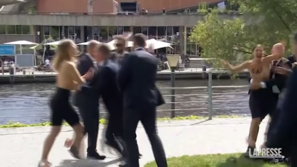 Germania, le attiviste Femen si spogliano davanti a Scholz e lo contestano: “Basta soldi a Putin”