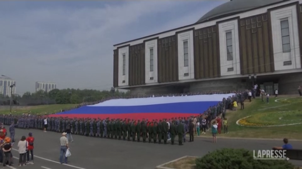 (LaPresse) In Russia le celebrazioni per la giornata nazionale della bandiera istituita nel Paese nel 1994. Una bandiera di 1.000 metri quadrati è stata srololata lunedì al Museo della Vittoria di Mosca mentre tre mila volontari con i colori bianco, rosso e blu, si sono poi riuniti in una piazza vicina per partecipare ai festeggiamenti. Si sono disposti in una fila di 165 metri formando la più grande bandiera del Paese.