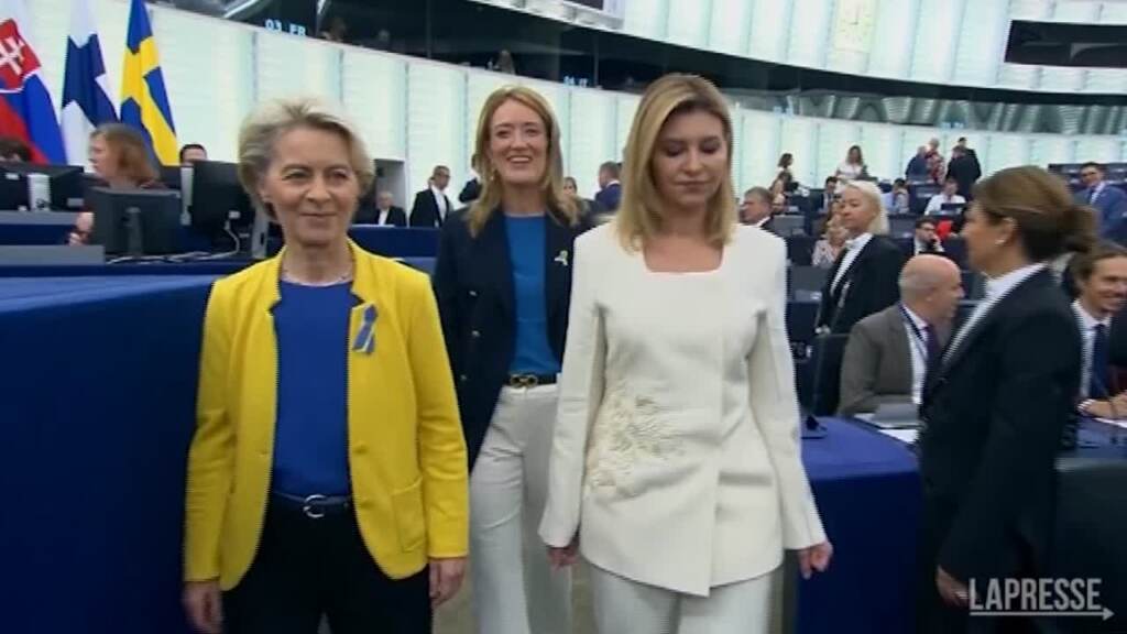 (LaPresse) La first lady ucraina, Olena Zelenska, è arrivata nell’aula della plenaria del Parlamento europeo a Strasburgo, vestita di bianco, assieme alla presidente della Commissione europea, Ursula von der Leyen, vestita in giallo e blu, i colori della bandiera ucraina.