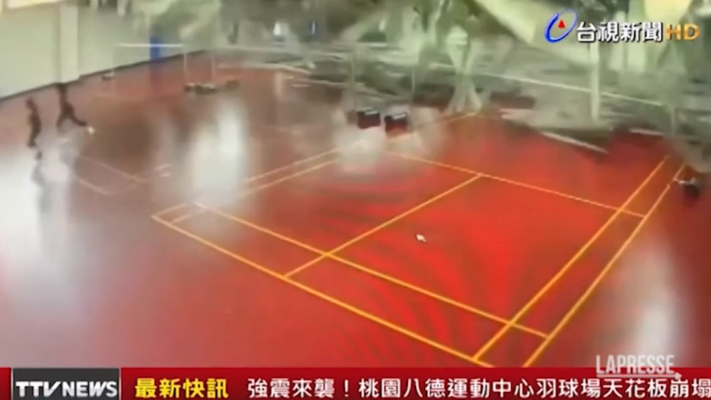 La scossa di terremoto di 7.2 che ha colpito Taiwan ha fatto il crollare il tetto di un centro sportivo a Taoyuan city, a 210 chilometri dall’epicentro, mentre alcune persone stavano giocando a badminton. Nelle immagini delle telecamere di sicurezza i giocatori fuggono per evitare i detriti ma un uomo è rimasto ferito.