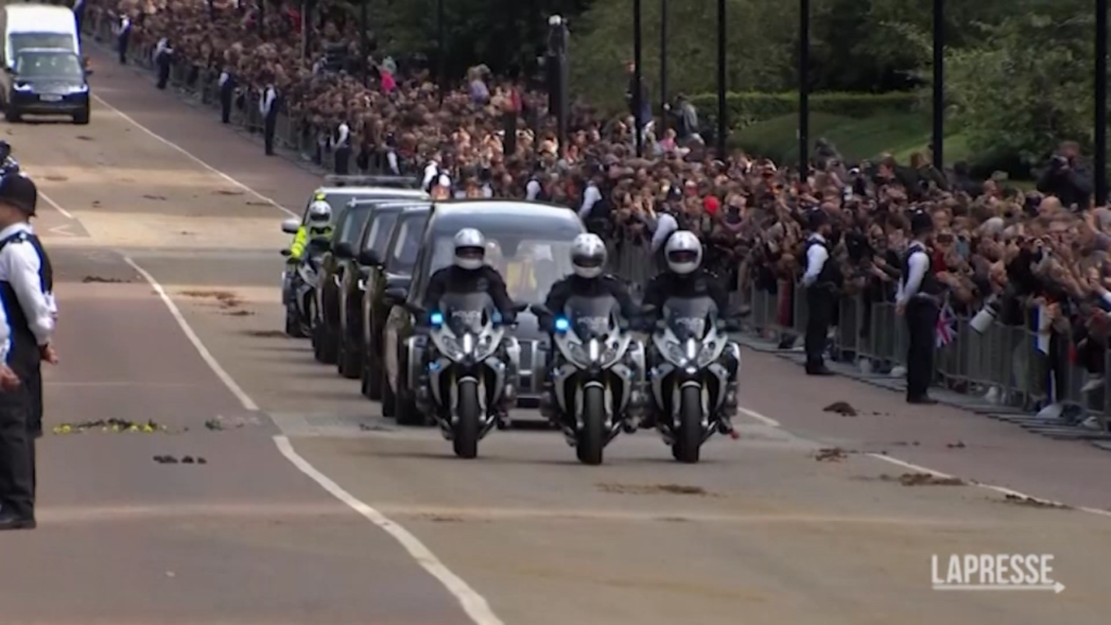 (LaPresse) Al termine delle esequie della Regina Elisabetta all’abbazia di Westminster l’auto funebre con il feretro ha attraversato Londra, per un corteo diretto a Windsor per la sepoltura della sovrana. Lungo il percorso la folla assiepata lungo le strade della capitale ha lanciato fiori verso l’auto che portava la bara di Elisabetta.