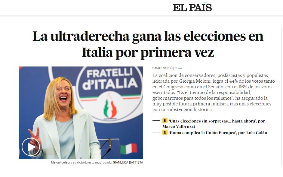 ‘Terremoto in Italia’. Così titolano i due maggiori quotidiani nazionali spagnoli, El Paìs ed El Mundo, in due editoriali sulla vittoria di Giorgia Meloni alle elezioni politiche italiane. “L’Italia, uno dei soci fondatori dell’Unione Europea, sarà quasi certamente governata da un partito nato sulla scia del fascismo mussoliniano”, scrive El Paìs, sottolineado che “mai prima d’ora un governo dell’Europa occidentale è stato guidato da una destra di ispirazione neofascista che mostra senza complicazioni il suo scetticismo anti-europeo e il suo belligerante nazional-populismo”. L’Europa entra quindi per la seconda volta in un territorio inesplorato (la prima era stata la Brexit), ma questo, avverte il quotidiano spagnolo, “non significa che non possa prevedere meccanismi di controllo, quando sono ancora in sospeso diverse consegne di fondi europei allo Stato che ne è il primo destinatario”. Secondo El Paìs “la disunità della sinistra ha punito elettoralmente qualsiasi possibilità di alternativa alla coalizione di destra, che ha beneficiato della riforma del sistema elettorale del 2018”. “L’incapacità della sinistra di stringere alleanze potrebbe aver condannato in gran parte il Paese al ritorno di Berlusconi e Salvini al governo sotto la guida di una figura emergente che ha saputo giocare le sue carte in modo efficace e coraggioso”, si legge nell’editoriale. L’Italia, avverte El Paìs, “è apertamente alla deriva verso l’estrema destra, ma l’Europa deve rafforzare i suoi meccanismi di controllo contro coloro che aspirano a destabilizzare l’Ue stessa”.