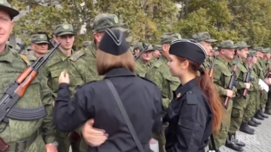 (LaPresse) Alcuni riservisti a Sevastapol, in Crimea, salgono sugli autobus e lasciano la città dopo la mobilitazione parziale annunciata dal presidente russo Putin. In città cerimonia di saluto con i familiari e la benedizione.