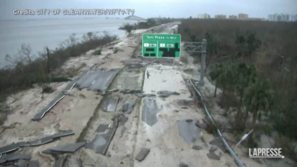 (LaPresse) La devastazione causata dall’Uragano Ian con le sue raffiche oltre i 200 km/h ha colpito anche la Sanibel Causeway nella città di Clearwater, staccando interi pezzi di asfalto e isolando Sanibel Island dalla zona di Fort Myers.